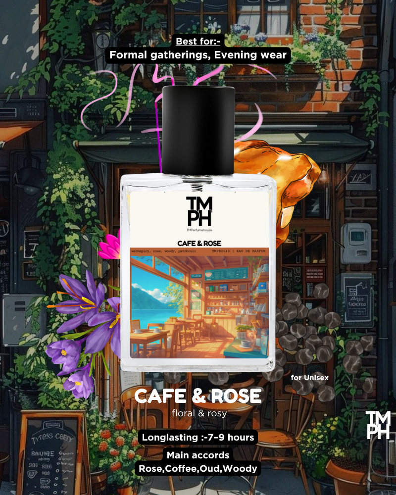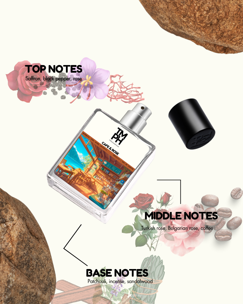 cafe & rose is an opulent fragrance that fuses floral elegance with bold intensity. Opening with saffron, black pepper, and may rose, it reveals a heart of Turkish rose and coffee, deepened by incense. The base of sandalwood, patchouli, and amber creates warmth and sensuality, making it mysterious and unforgettable.