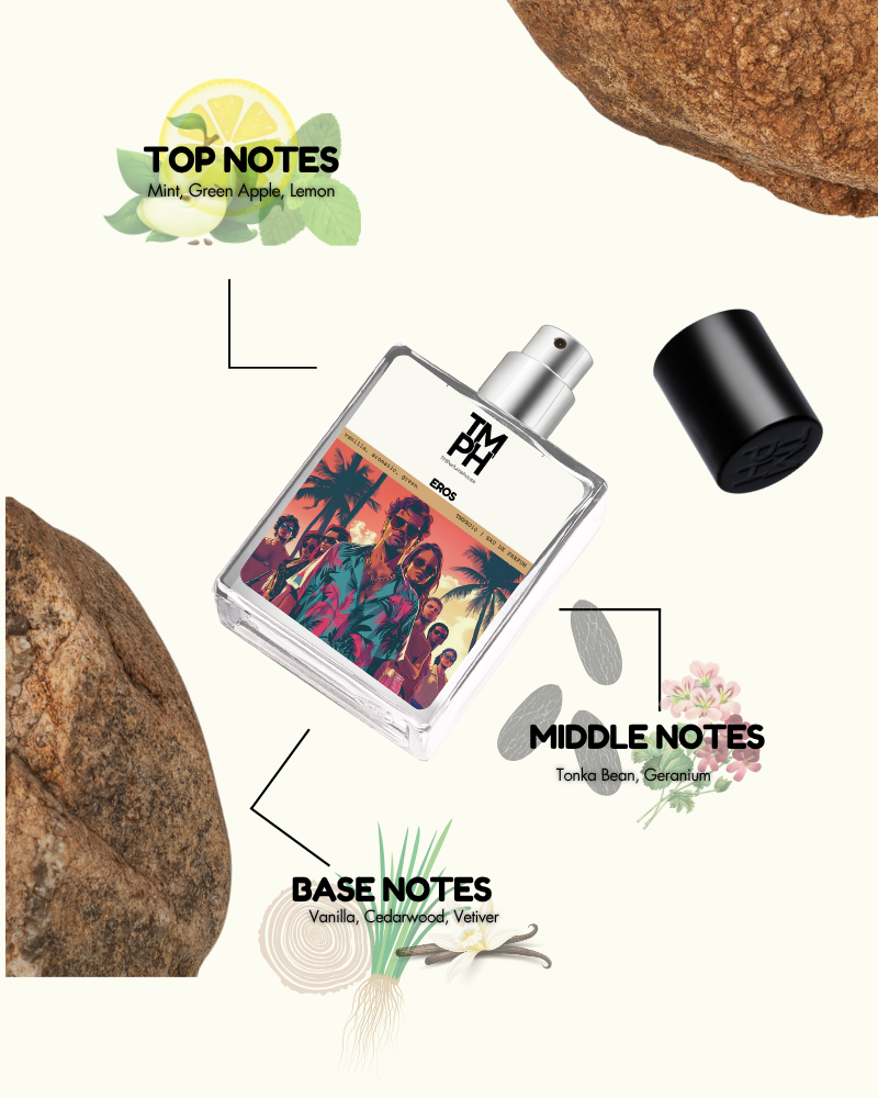 Eros captures desire and strength through its dynamic blend of refreshing mint, juicy green apple, and bright citrus, layered with creamy vanilla and powerful woody notes. Seductive and energetic, it symbolizes confidence and charisma. Perfect for nights out, Eros is a fragrance of love, attraction, and timeless masculine allure.