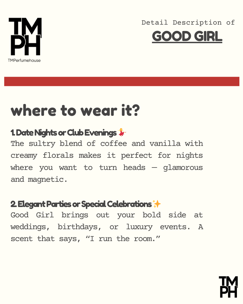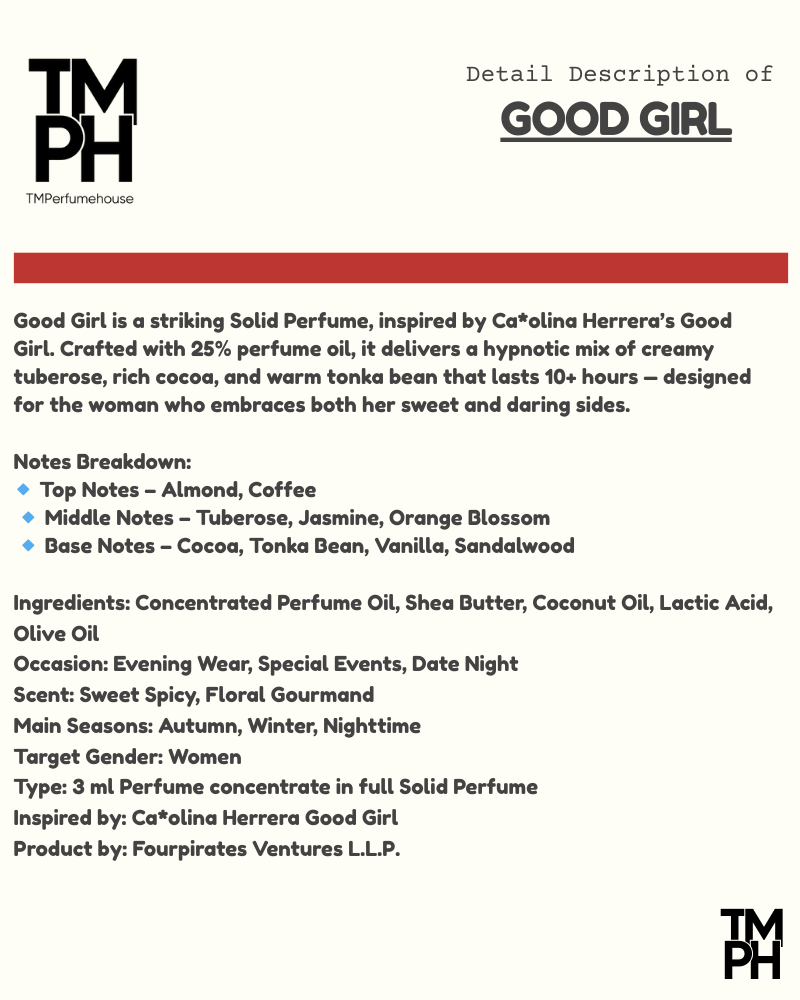 Good Girl is a striking Solid Perfume, inspired by Ca*olina Herrera’s Good Girl. Crafted with 25% perfume oil, it delivers a hypnotic mix of creamy tuberose, rich cocoa, and warm tonka beanthat lasts 10+ hours — designed forthe woman who embraces both her sweetand daring sides.