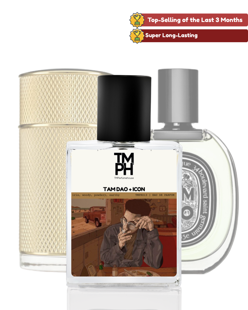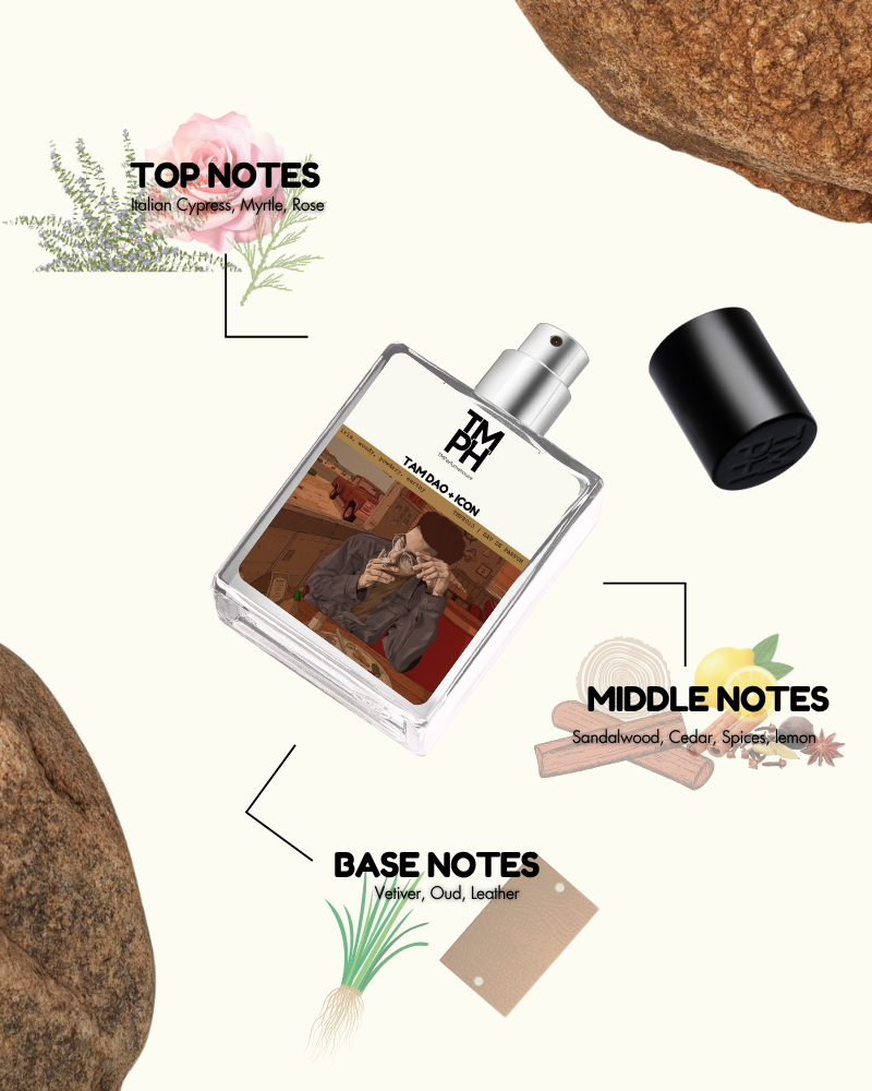 tam dao + icon intertwines the meditative warmth of sandalwood with the crisp, confident energy of citrus and spices. The fragrance opens with fresh brightness, unfolds into smoky vetiver and cedar, and settles into creamy sandalwood depth. Balanced yet distinctive, it evokes elegance, strength, and timeless charm in one signature scent.
