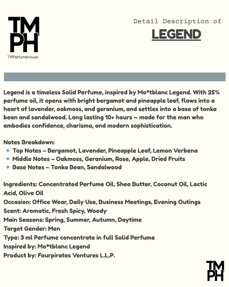 Legendis a timeless Solid Perfume, inspired by Mo*tblanc Legend. With 25% perfume oil, it opens with bright bergamot and pineapple leaf, flows into a heart of lavender, oakmoss, and geranium, and settles into a base of tonka bean and sandalwood. Long lasting 10+ hours — made for the man who embodies confidence, charisma, and modern sophistication.
