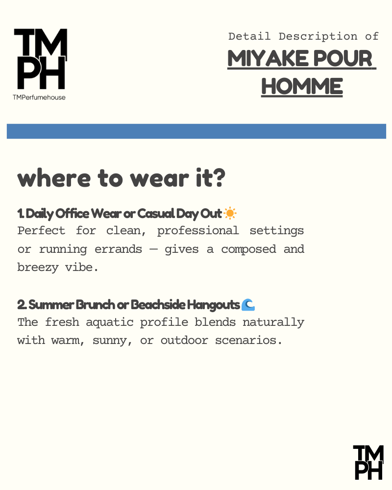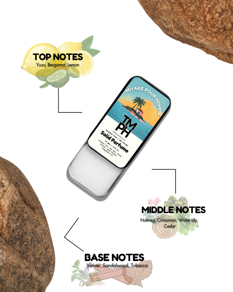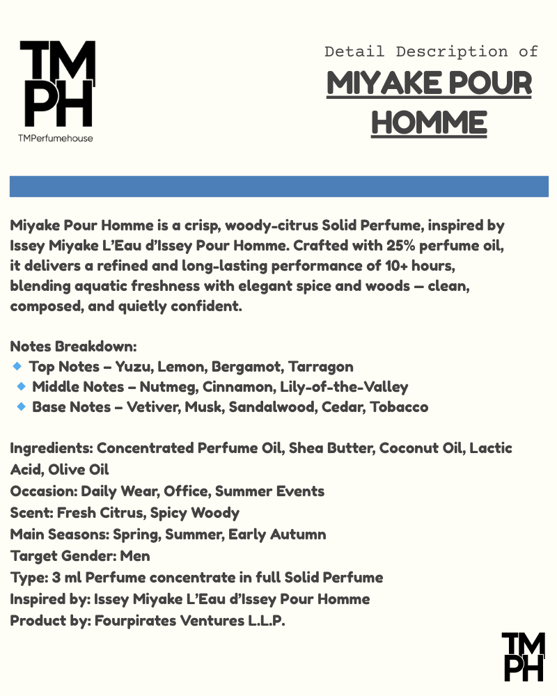 Miyake Pour Homme is a crisp, woody-citrus Solid Perfume, inspired by Issey Miyake L’Eau d’Issey Pour Homme. Crafted with 25% perfume oil, it delivers a refined and long-lasting performance of 10+ hours, blending aquatic freshness with elegant spice and woods clean, composed, and quietly confident.