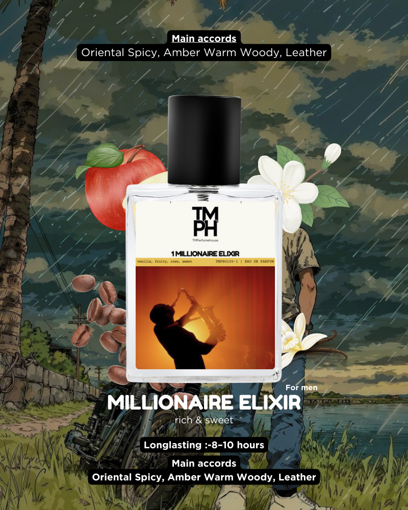 1 Millionaire elixir bursts with rich apple and davana, blended with rose and osmanthus, anchored by smooth cedar, patchouli, and vanilla. Deep, sensual, and long-lasting, it offers a luxurious evolution from fruity brightness to woody warmth. 1 Millionaire elixir is bold, sophisticated, and magnetic, leaving a lasting trail of passion and power.
