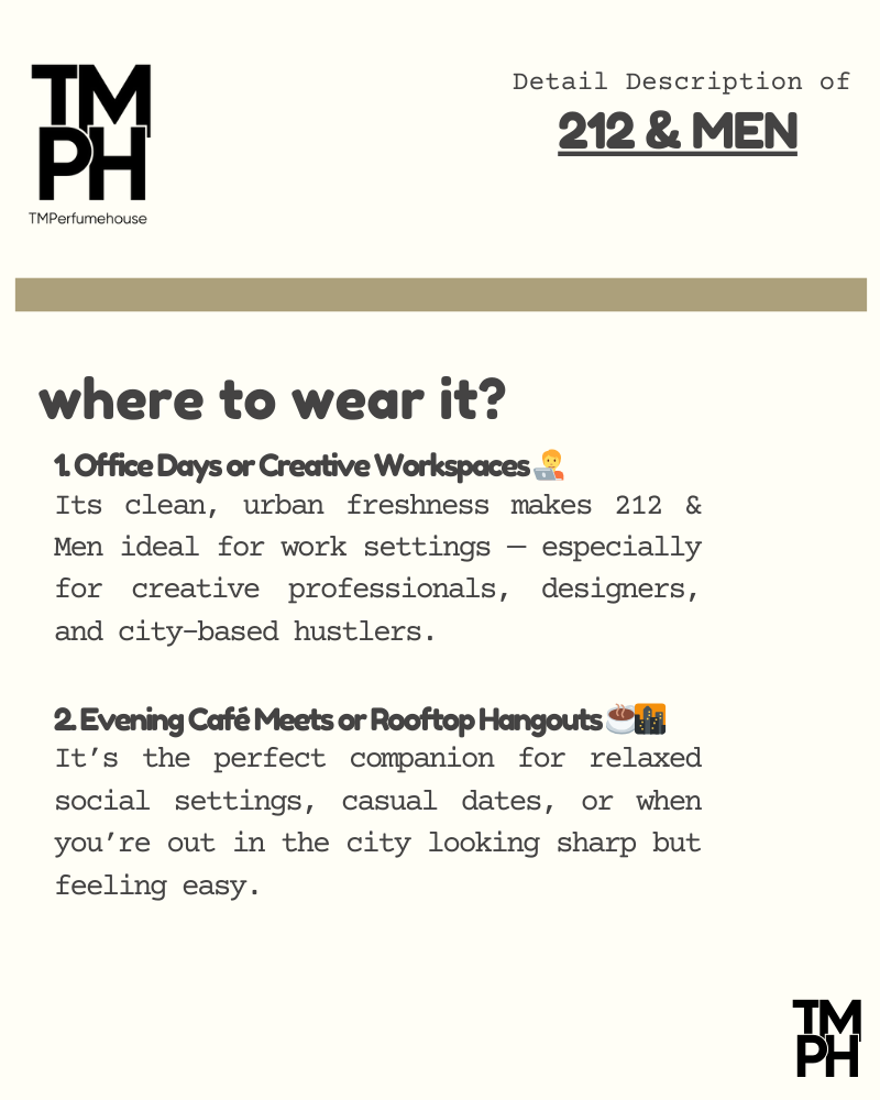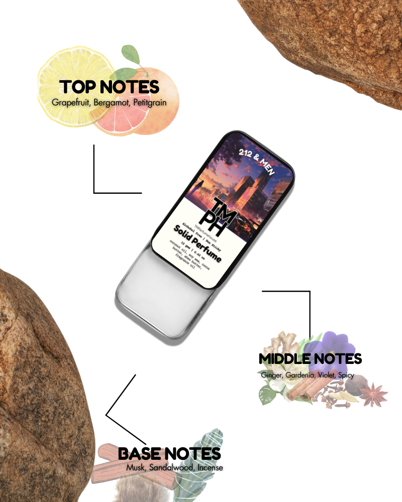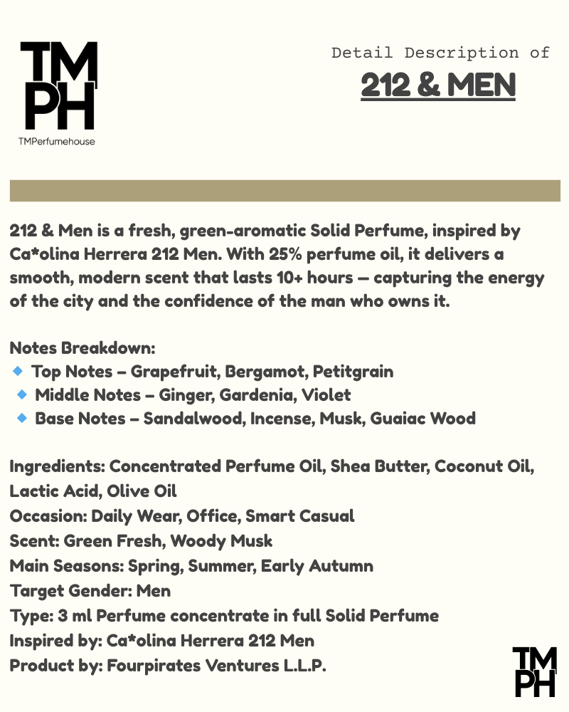 212 & Men is a fresh, green-aromatic Solid Perfume, inspired by Ca*olina Herrera 212 Men. With 25% perfume oil, it delivers a smooth, modern scent that lasts 10+ hours — capturing the energy of the cityand the confidence of the man who owns it.