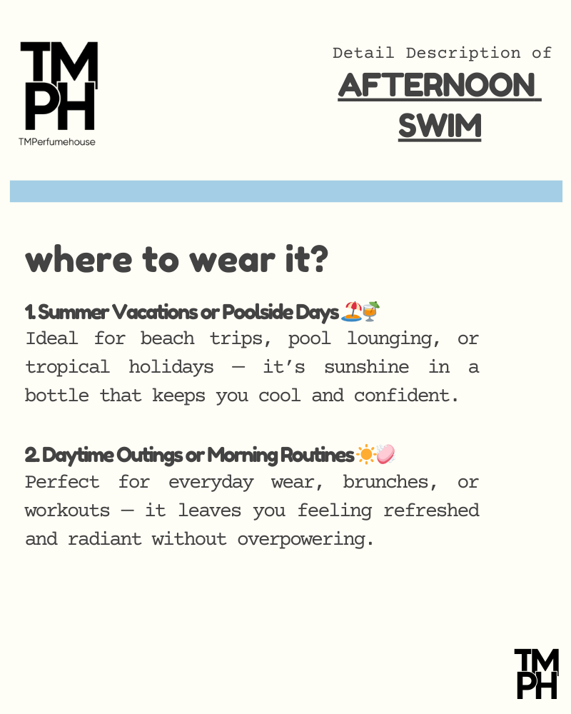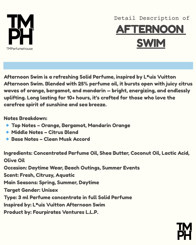 Afternoon Swimis a refreshing Solid Perfume, inspired by L*uis Vuitton Afternoon Swim. Blended with 25% perfumeoil, it bursts open with juicy citrus wavesof orange, bergamot, and mandarin — bright, energizing, and endlessly uplifting. Long lasting for 10+ hours, it’s crafted for those who love the carefree spirit of sunshine and sea breeze.