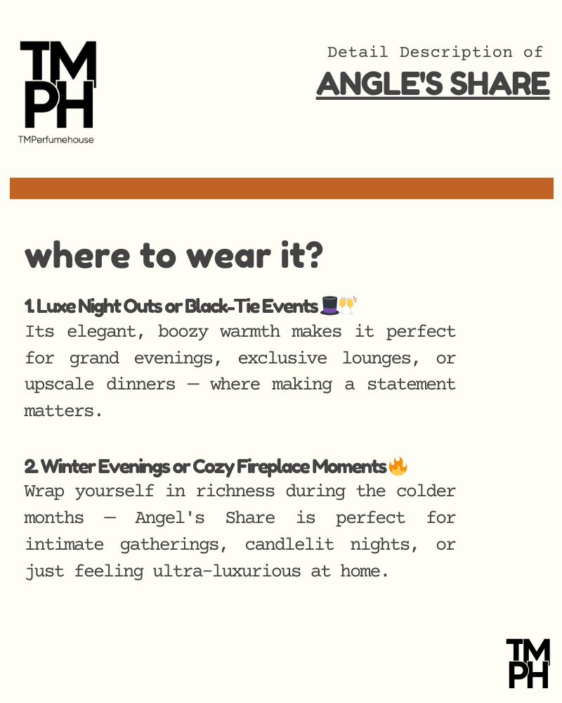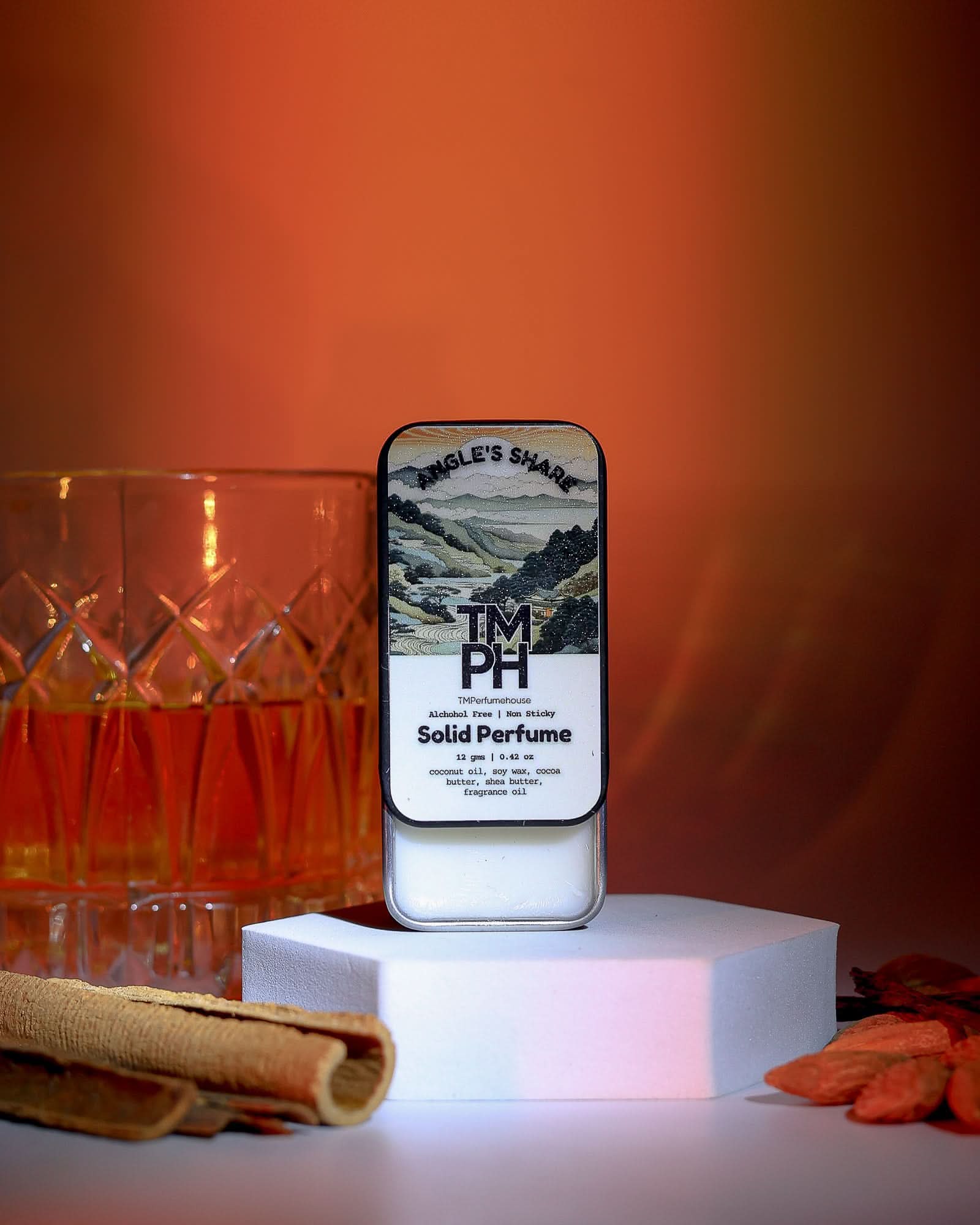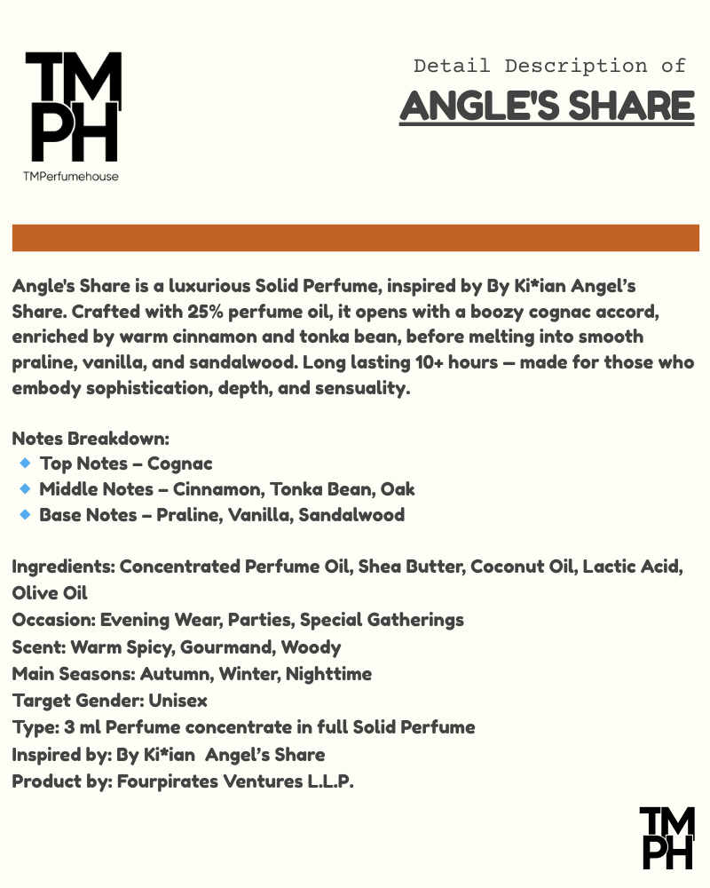 Angle's Share isa luxurious Solid Perfume, inspired by By Ki*ian Angel’s Share. Crafted with 25% perfume oil, it opens with a boozy cognac accord, enriched by warm cinnamon and tonka bean, before meltinginto smooth praline, vanilla, and sandalwood. Long lasting 10+ hours — made for those who embody sophistication, depth, and sensuality.