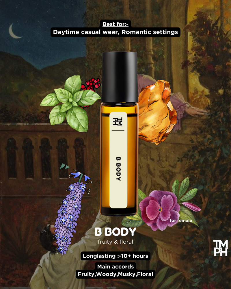 B BODY AT is a modern, aromatic–woody masculine attar inspired by clean and charismatic designer fragrances. It opens with a bright burst of bergamot and marine freshness, settles into a smooth lavender–clary sage heart, and dries down into a deep blend of cedarwood, amber, and musk. Cool, elegant, and long lasting perfect for men who love a fresh, confident, everyday signature scent.