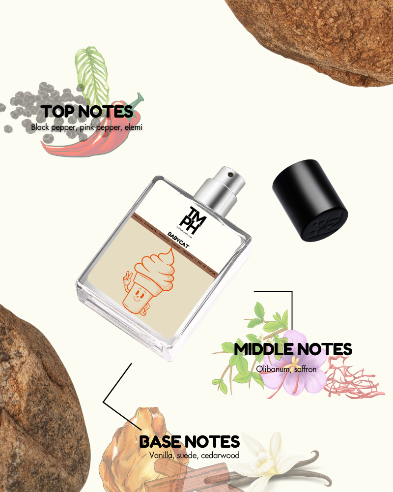 babycat is a captivating amber-vanilla scent with a bold, seductive edge. It opens with black pepper, pink pepper, and elemi for a spicy kick, unveiling a heart of olibanum and saffron that adds smoky depth. The base of smooth bourbon vanilla and suede creates warmth, elegance, and irresistible sophistication.