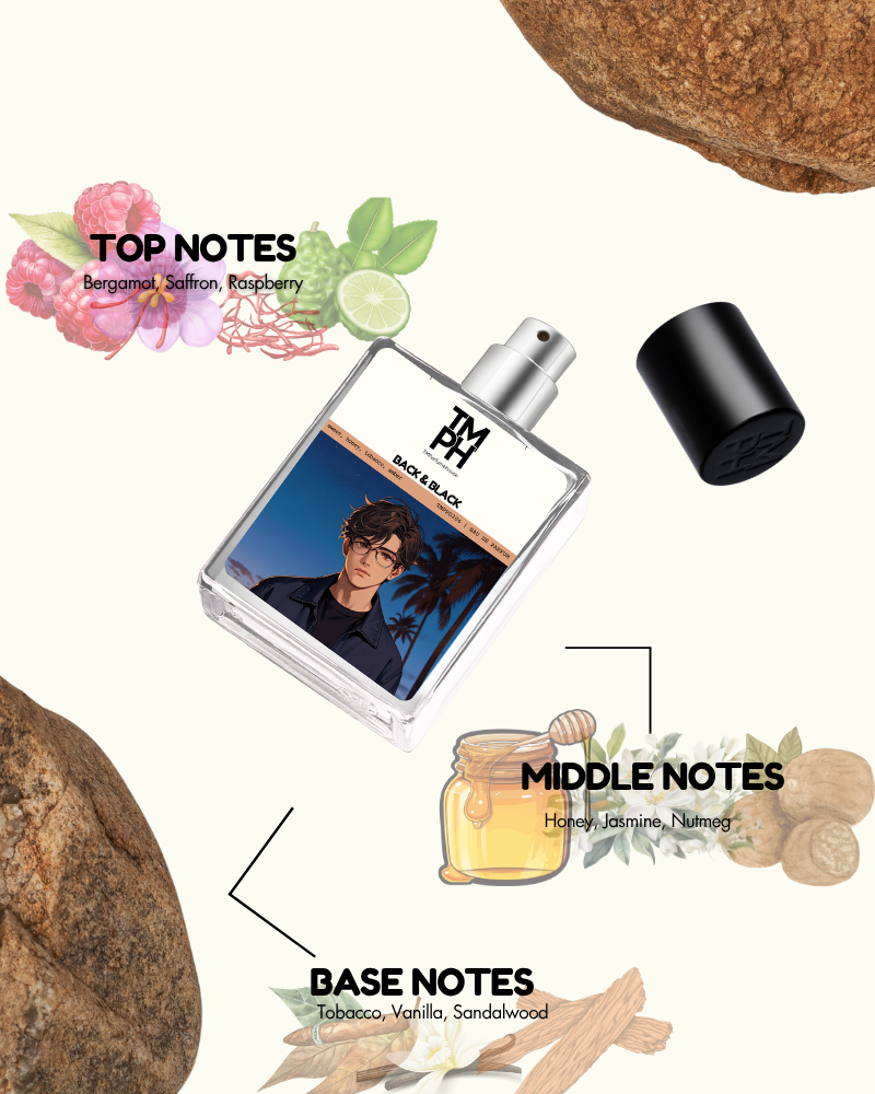 back & black is an opulent scent that captures mystery and seduction. It opens with sweet honey, saffron, and raspberry, leading into a heart of tobacco, incense, and cedarwood for depth. The base of patchouli, vanilla, and almond adds warmth, creating a luxurious fragrance that is bold, smooth, and irresistibly captivating.