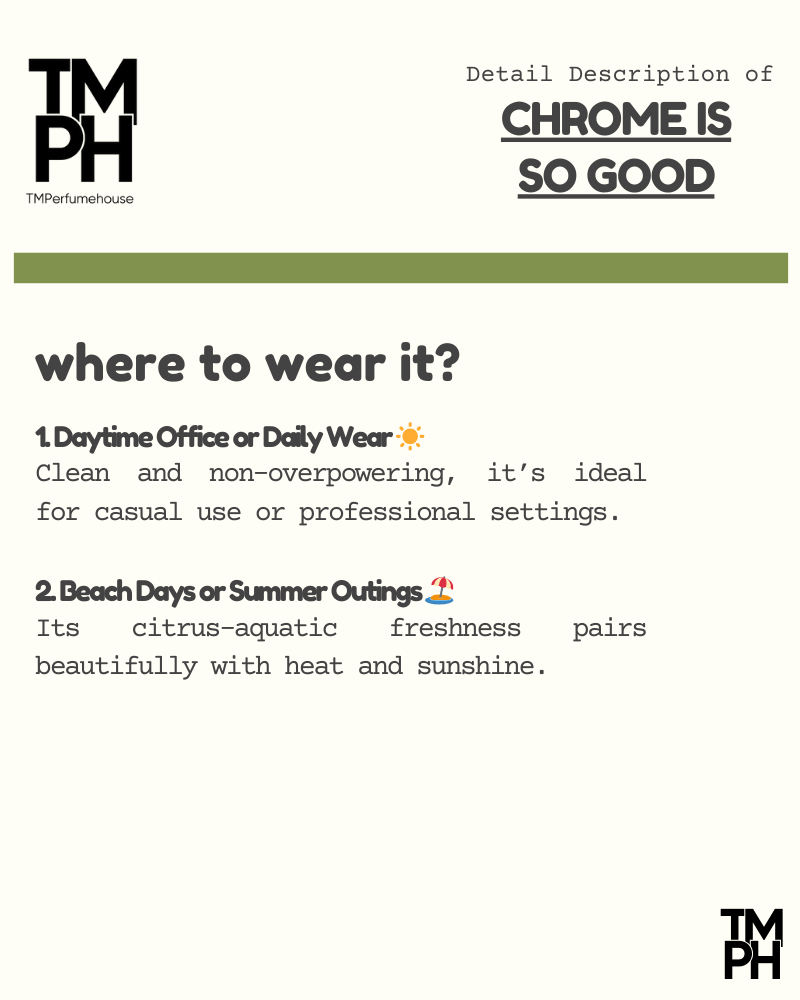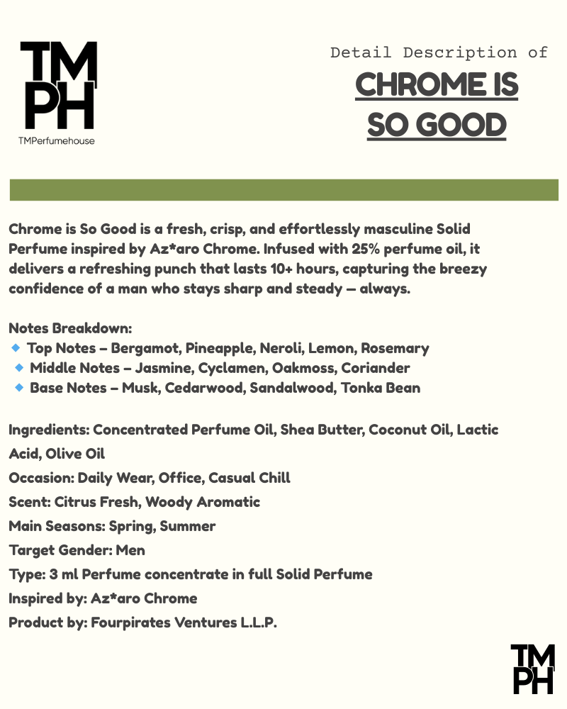 Chromeis So Goodis a fresh, crisp, and effortlessly masculine Solid Perfume inspired by Az*aro Chrome. Infused with 25% perfume oil, it delivers a refreshing punch that lasts 10+ hours, capturing the breezy confidence of a man who stays sharp andsteady — always.