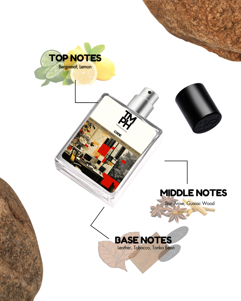 Code opens with fresh lemon and bergamot, weaving into a heart of star anise and olive blossom for subtle intrigue. Settling into rich leather, tobacco, and tonka bean, it creates a warm, seductive base. Refined yet magnetic, Code embodies modern masculinity, leaving an unforgettable trail of confidence, charm, and sophistication.