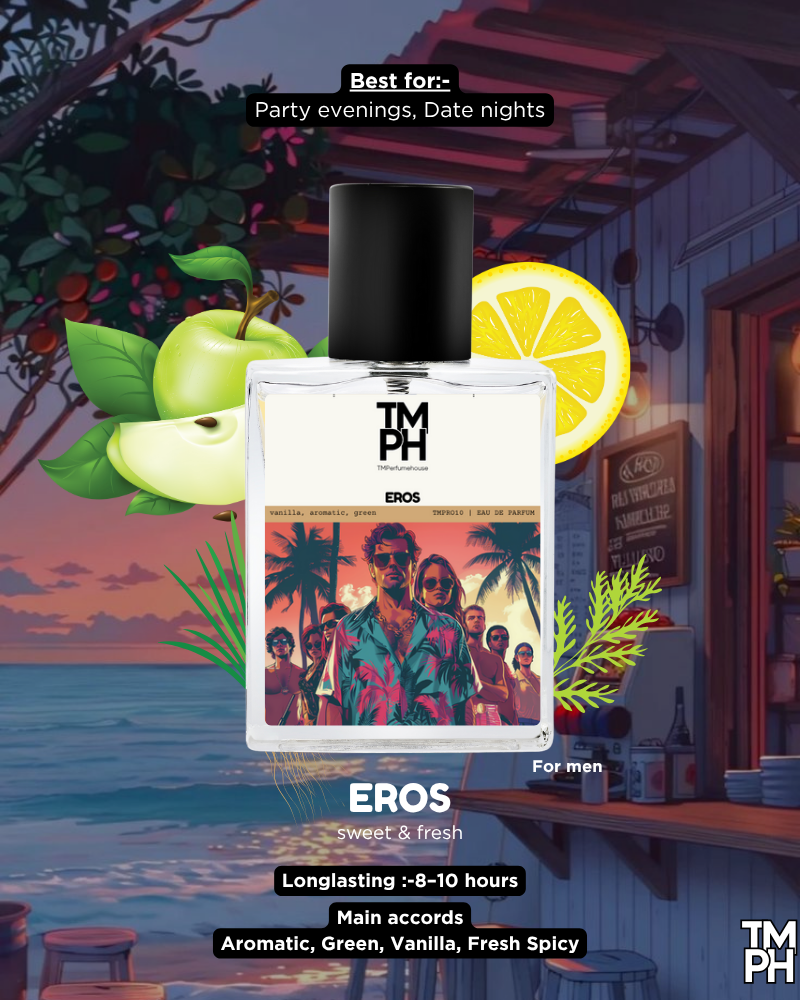 Eros captures desire and strength through its dynamic blend of refreshing mint, juicy green apple, and bright citrus, layered with creamy vanilla and powerful woody notes. Seductive and energetic, it symbolizes confidence and charisma. Perfect for nights out, Eros is a fragrance of love, attraction, and timeless masculine allure.