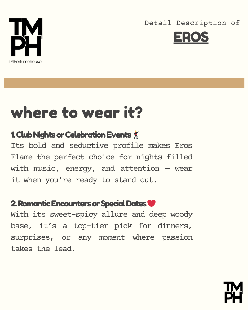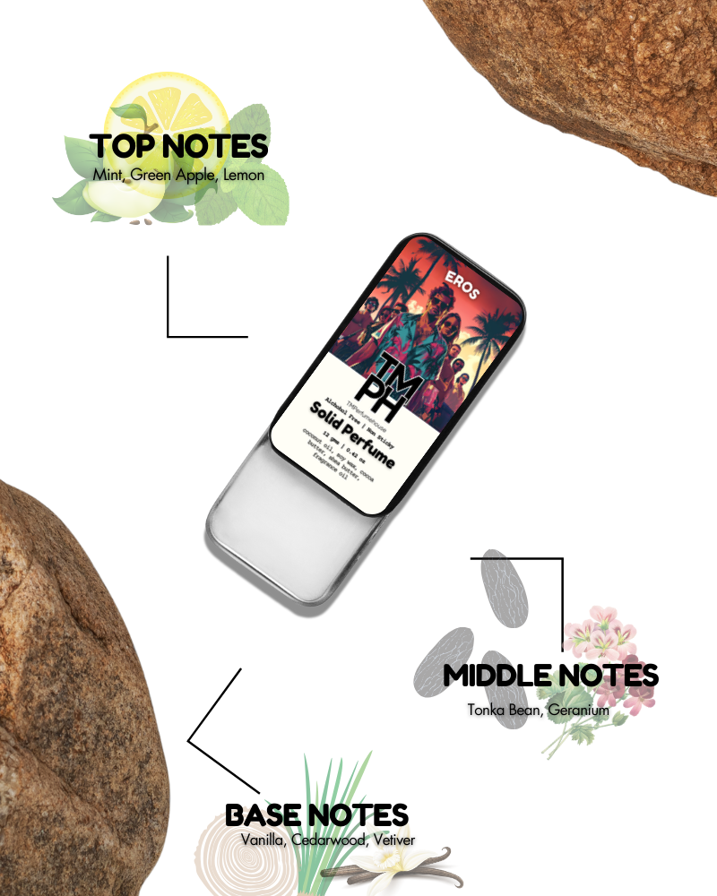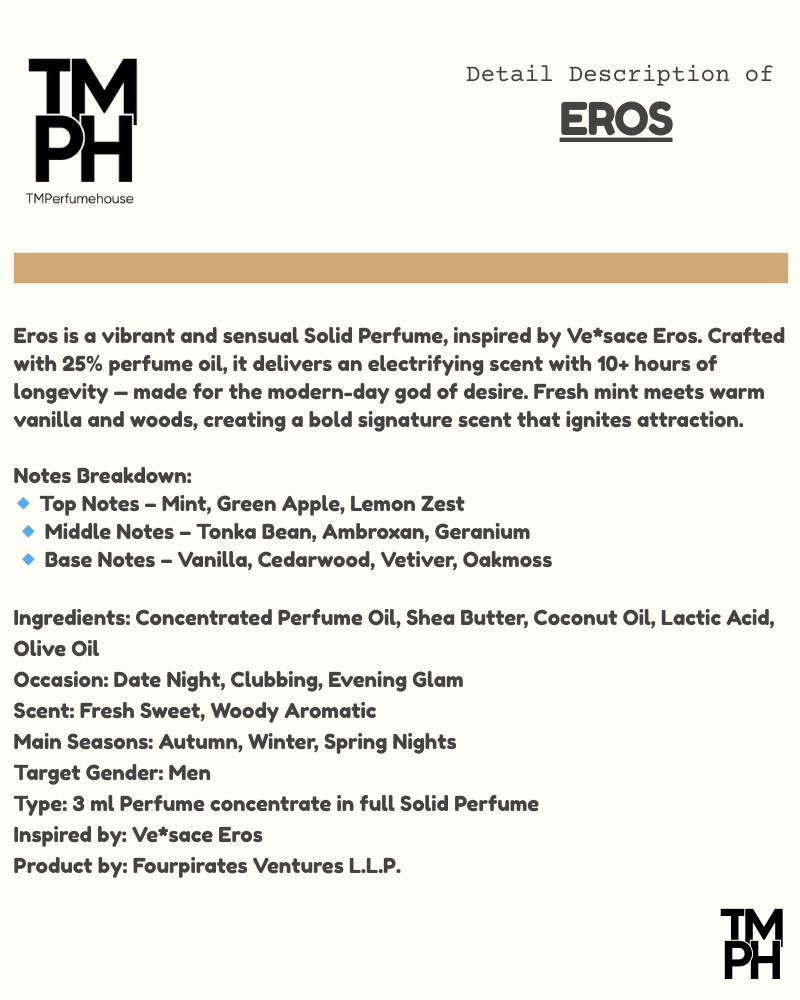 Eros is a vibrant and sensual Solid Perfume, inspired by Ve*sace Eros. Crafted with 25% perfume oil, it delivers an electrifying scent with 10+ hours of longevity — made for the modern-day god of desire. Fresh mint meets warm vanilla and woods, creating a bold signature scent that ignites attraction.