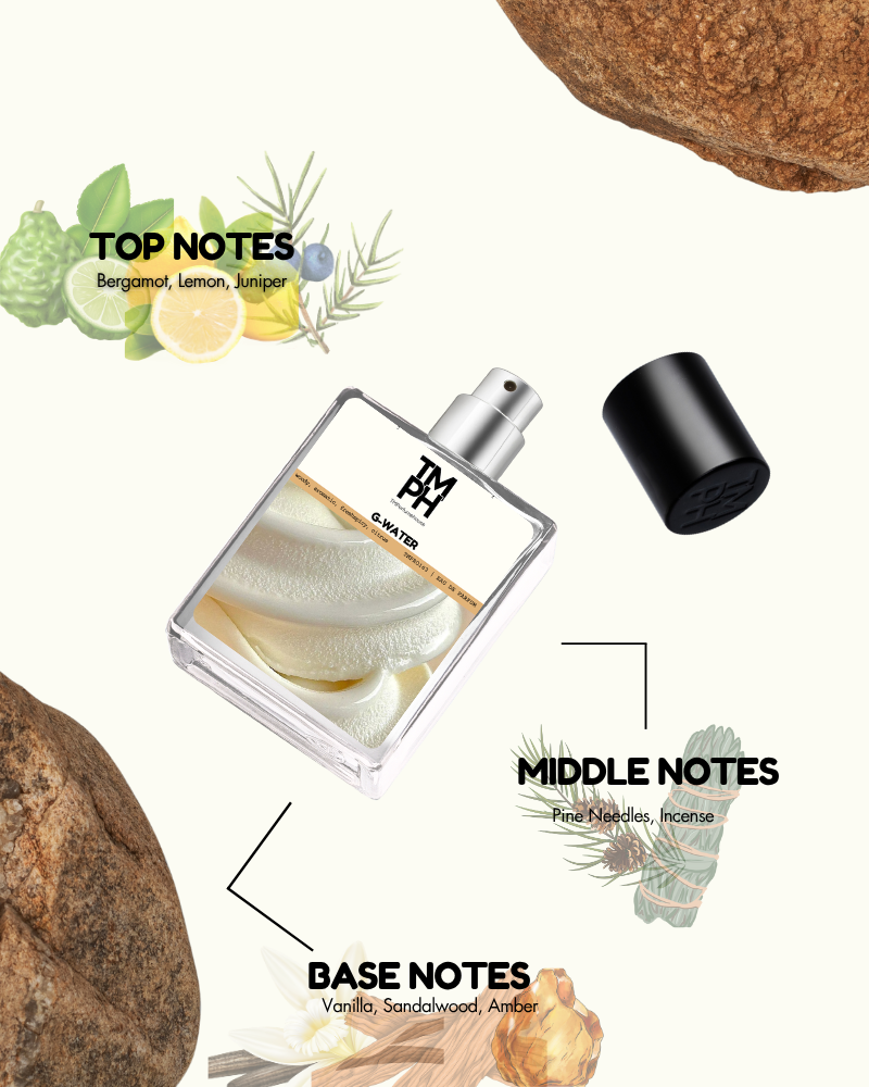 g-water is an evocative scent that captures the essence of wanderlust and nature. It opens with bright bergamot, lemon, and juniper berries, leading into a heart of pine needles, incense, and orris for earthy depth. The base of sandalwood, vanilla, and amber creates warmth, leaving a dreamy, elegant, and adventurous trail.