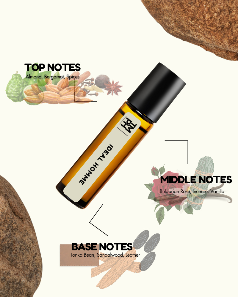IDEAL HOMME AT is a refined, aromatic–woody masculine attar inspired by luxurious designer fragrances. It opens with a fresh burst of citrus and spicy notes, flows into a smooth heart of almond, lavender, and floral nuances, and dries down into a warm base of cedarwood, tonka bean, and musk. Sophisticated, elegant, and long lasting — perfect for men who want a classy, confident, and modern signature scent.