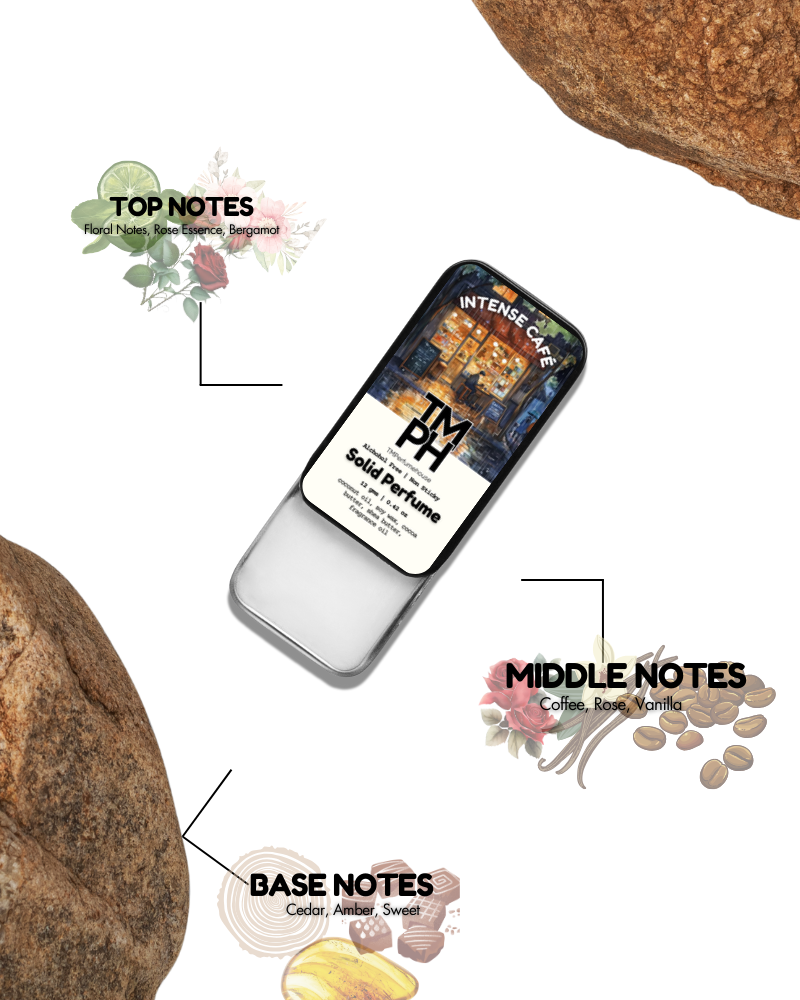 Intense Café Solid Perfume brings a rich, warm, and addictive aroma that blends sweetness with depth. Specifically, it opens with a soft burst of floral freshness that feels cozy on your skin. First, the fragrance moves into a creamy heart of coffee and rose for a luxurious touch. The concentrated balm finally settles into a warm vanilla-amber base. Consequently, this scent creates an effortlessly captivating presence for evenings and winter days.