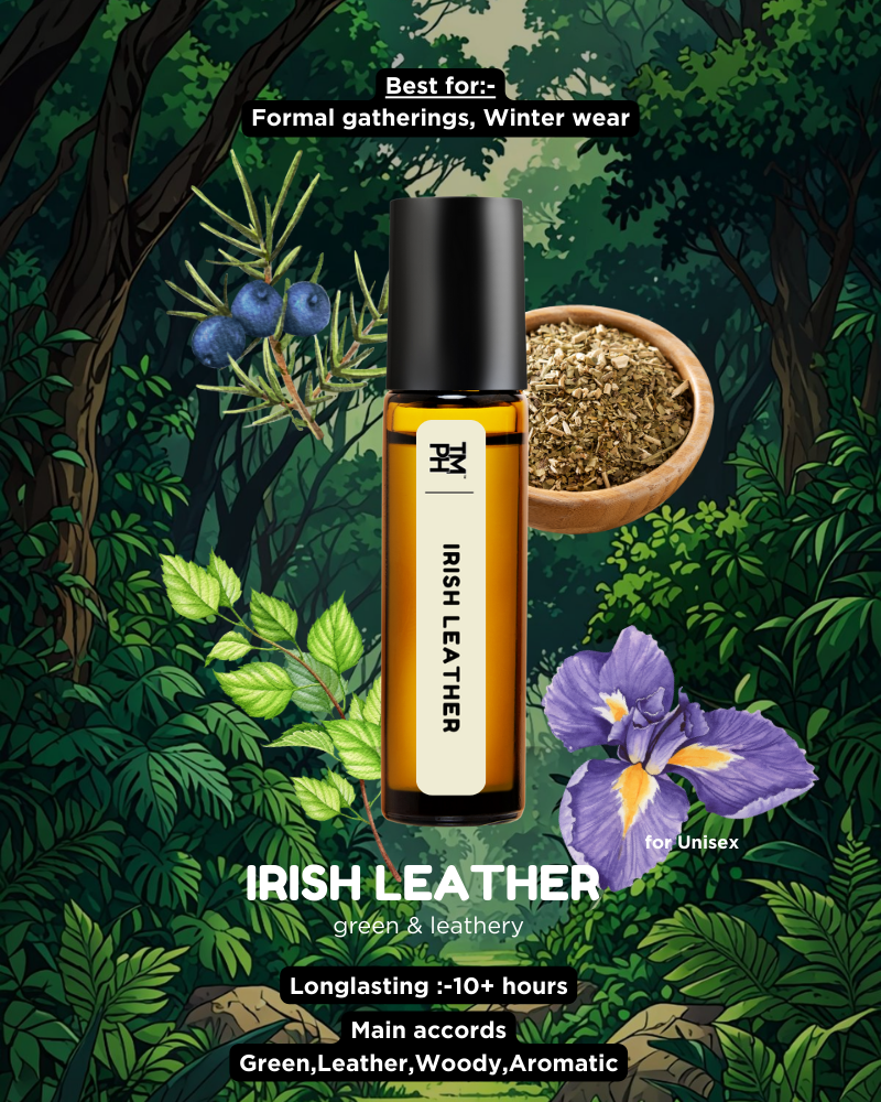 The Irish Leather luxury attar oil delivers a bold and rugged experience. Specifically, rugged countryside luxury fragrances inspire this unisex blend. It opens with a fresh hit of juniper berries and green herbal notes for a sharp start. First, the scent transitions into a powerful heart of leather and mate tea. This fragrance finally settles into a deep blend of woods, amber, and musk. Consequently, it stays wild and sophisticated throughout the day. Therefore, it is perfect for those who love a sharp, outdoorsy scent with premium leather elegance.