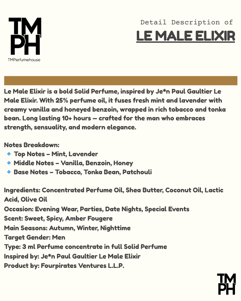 Le Male Elixir is a bold Solid Perfume, inspired by Je*n Paul Gaultier Le Male Elixir. With 25% perfume oil, it fuses fresh mint and lavender with creamy vanilla and honeyed benzoin, wrapped in rich tobacco and tonka bean. Long lasting 10+ hours — crafted for the man who embraces strength, sensuality, and modern elegance.