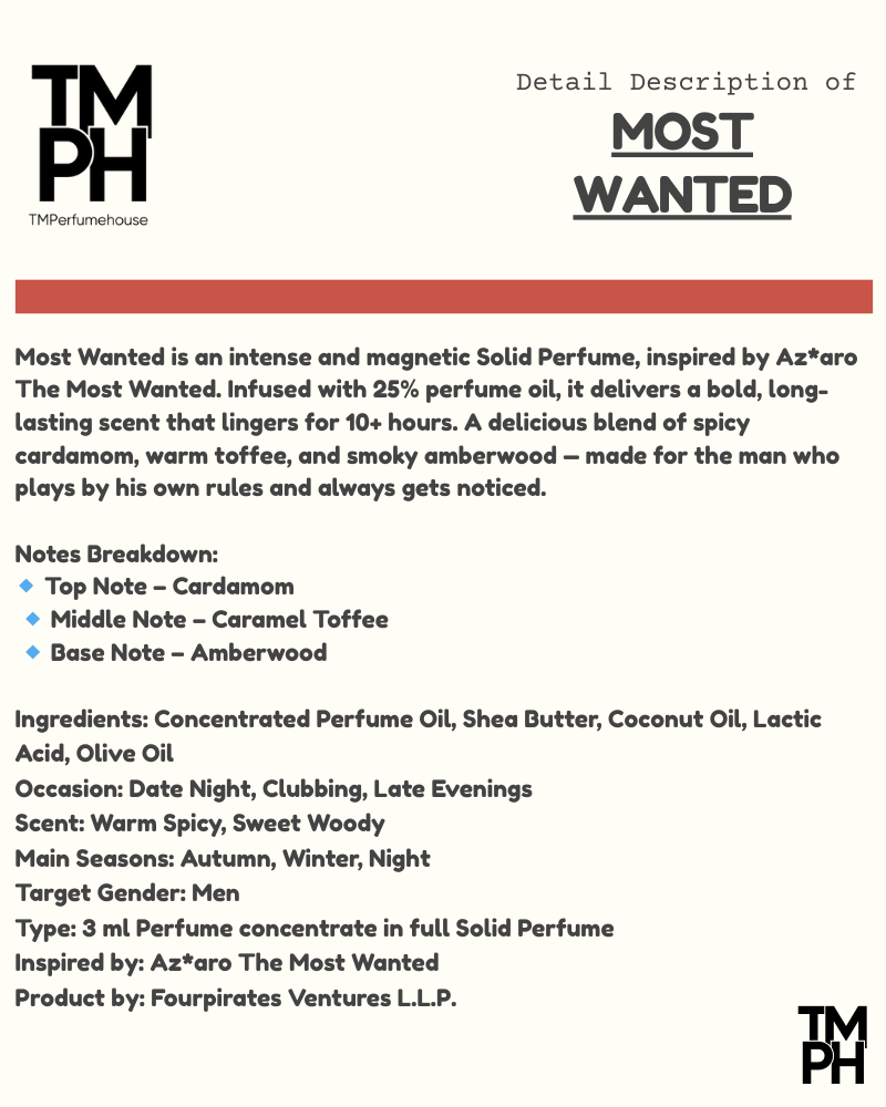 Most Wanted is an intense and magnetic Solid Perfume, inspired by Az*aro The Most Wanted. Infused with 25% perfume oil, it delivers a bold, long-lasting scent that lingers for 10+ hours. A delicious blend of spicy cardamom, warmtoffee, and smoky amberwood — made for the man whoplaysby his own rules and always gets noticed.