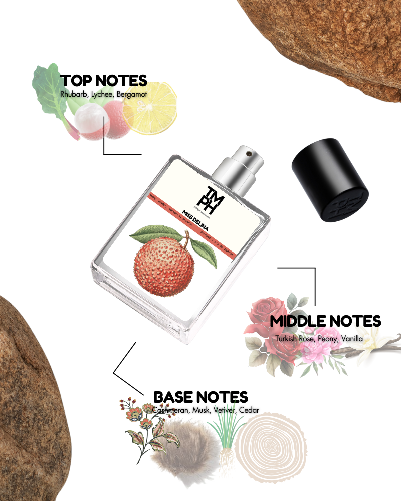 Miss delina blooms with vibrant Turkish rose and peony, sweetened by lychee and rhubarb. A soft base of vanilla, cashmeran, and musk gives warmth and depth. Feminine, romantic, and sophisticated, it’s a fragrance that embodies charm, elegance, and a playful spirit with irresistible allure.