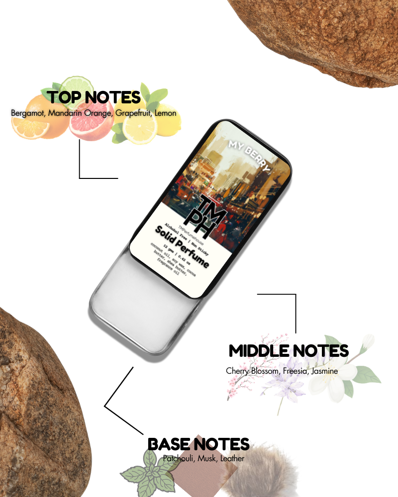 My Berry Solid Perfume brings a sweet, fruity, and playful fragrance experience for those who love light scents. First, it opens with bright berry and citrus top notes that create a cheerful and refreshing mood. The scent then flows into a soft, floral-berry heart to provide a fun and youthful feel. Finally, it settles into a subtle, creamy base that stays fresh on your skin all day.