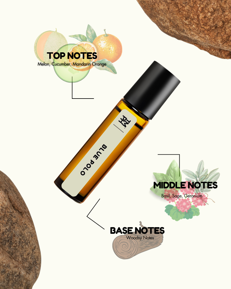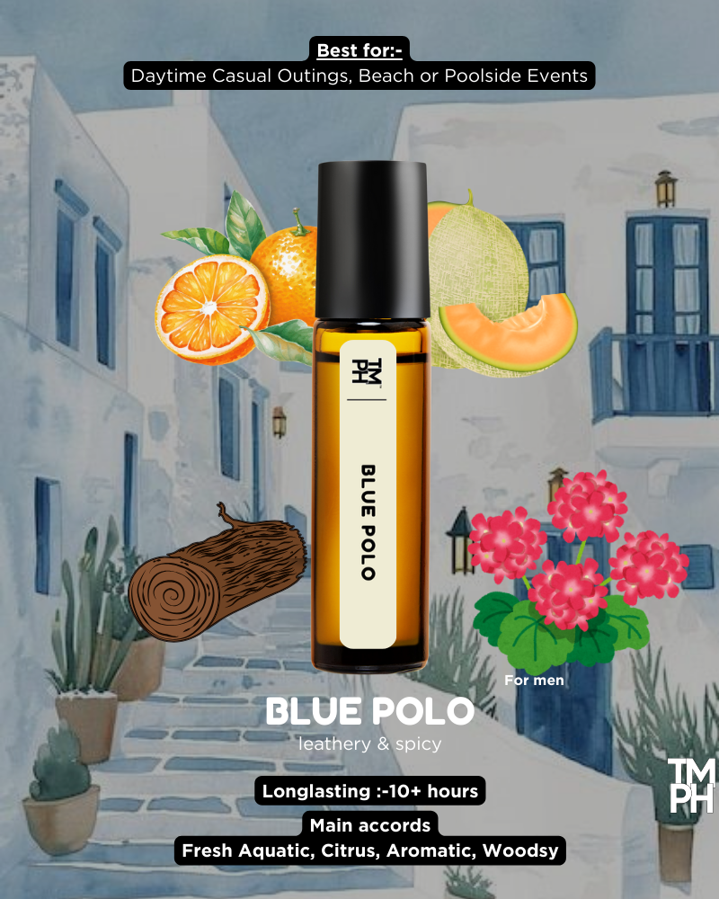BLUE POLO AT by TMPerfumehouse is a fresh, clean, and energetic fragrance made for men who love a sporty yet classy scent. It opens with cooling notes of Cucumber, Melon, and Mandarin Orange, followed by an aromatic heart of Basil, Sage, and Geranium. The base settles into soft Suede, Musk, and Woody notes, giving a smooth and long-lasting finish.