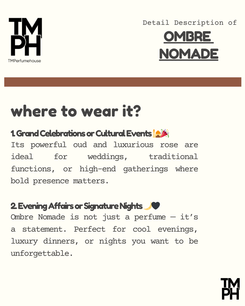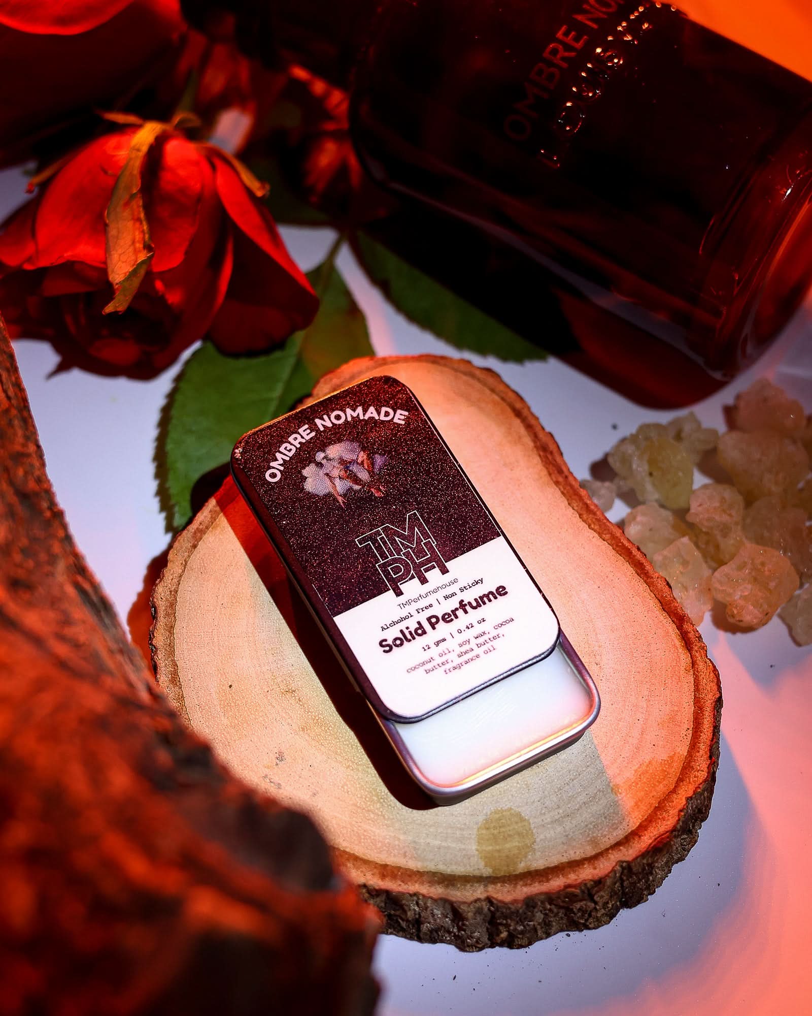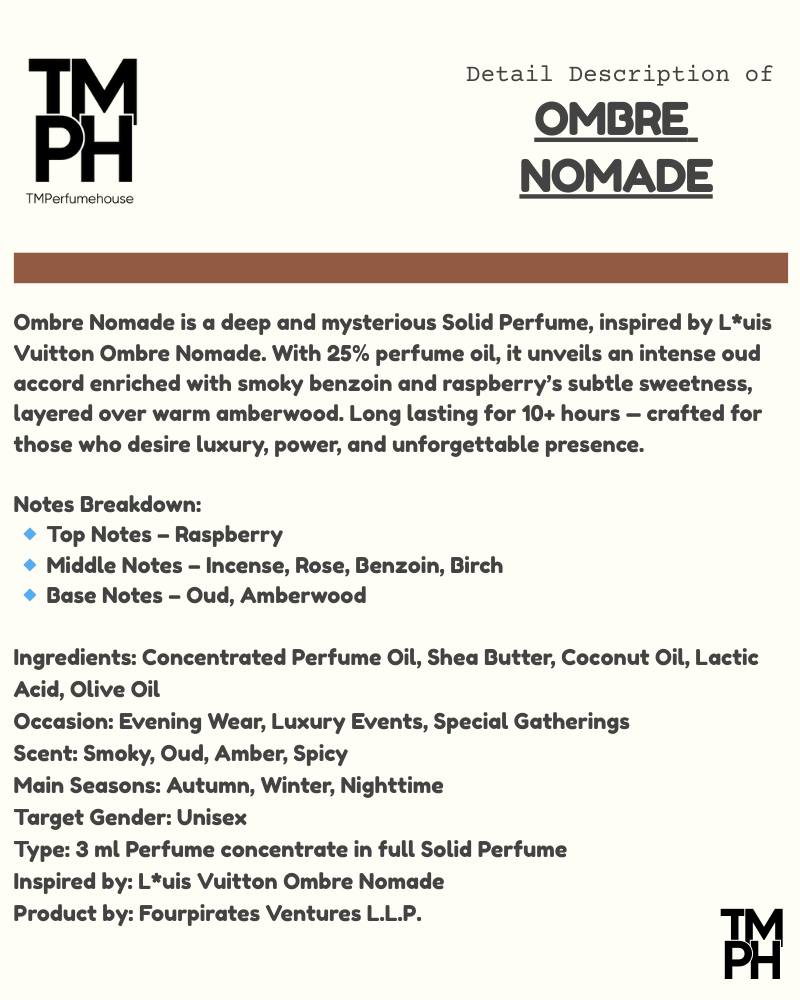 Ombre Nomade is a deep andmysterious Solid Perfume, inspired by L*uis Vuitton Ombre Nomade. With 25% perfume oil, it unveils anintense oud accord enriched with smoky benzoin and raspberry’s subtle sweetness, layered over warm amberwood. Long lasting for 10+ hours — crafted for those who desire luxury, power, and unforgettablepresence.