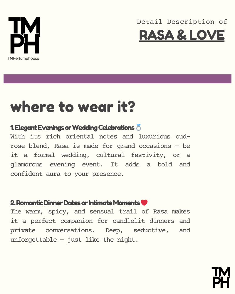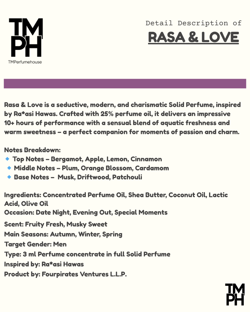 Rasa & Love is a seductive, modern, and charismatic Solid Perfume, inspired by Ra*asi Hawas. Crafted with 25% perfume oil, it delivers an impressive 10+ hours of performance with a sensual blend of aquatic freshness and warm sweetness – a perfect companion for moments of passion and charm.