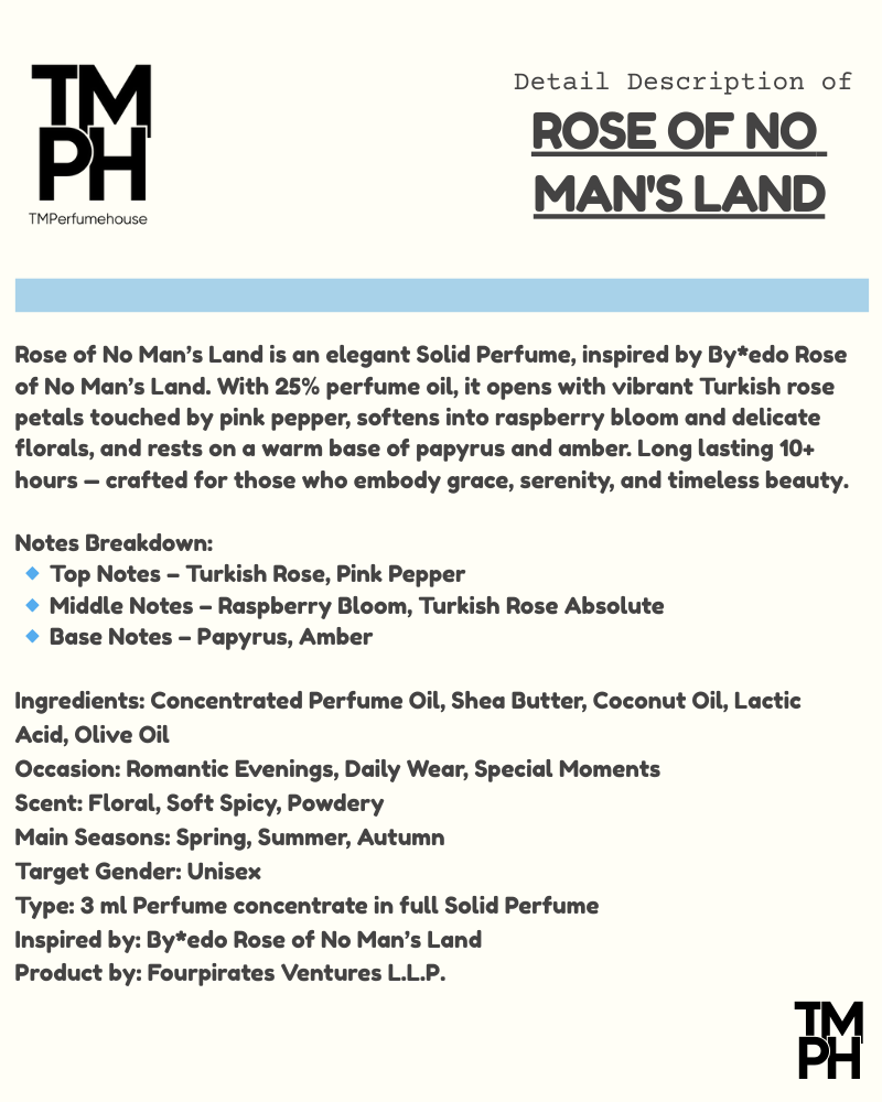 Rose of No Man’s Land is an elegant Solid Perfume,inspired by By*edo Rose of No Man’s Land. With 25% perfume oil, it opens with vibrant Turkish rose petals touched by pink pepper, softens into raspberry bloom and delicate florals, and rests on a warm base of papyrus and amber. Long lasting 10+ hours — crafted for those who embody grace, serenity, and timeless beauty.