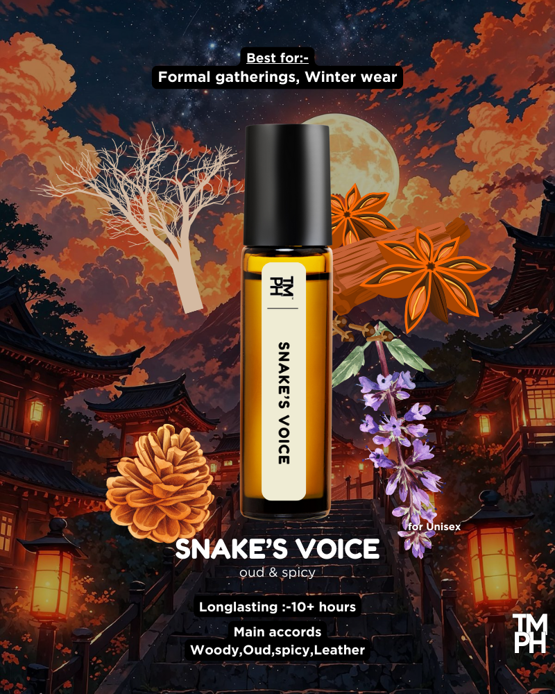 SNAKE’S VOICE AT is a dark, mysterious, and hypnotic unisex attar inspired by seductive spicy-amber fragrances. It opens with a dangerous hit of black pepper and saffron, melts into a smoky heart of oud, leather, and rose, and settles into a deep base of amber, vanilla, and dark woods. Intense, addictive, and unforgettable — a scent that speaks softly but leaves a powerful impact.
