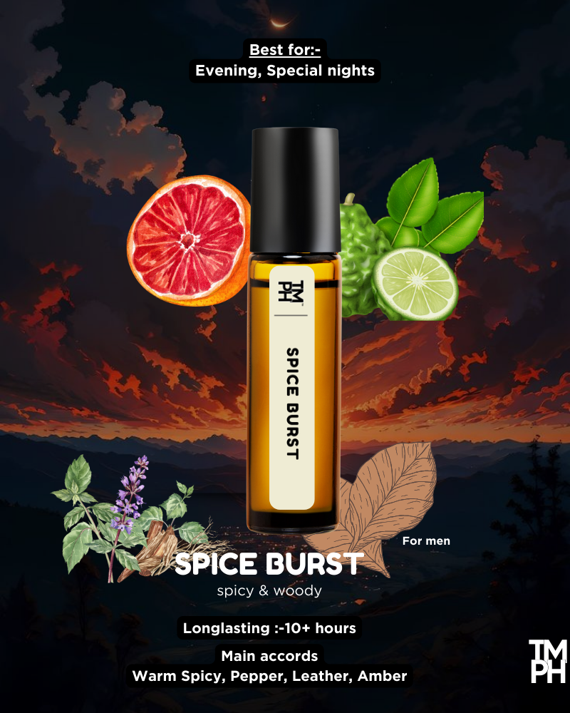 Spice Burst AT is a fiery, addictive, and intensely masculine fragrance that feels like an explosion of spice wrapped in sensual warmth. It begins with a bold spark of pink pepper, cinnamon, and saffron — hot, spicy, and instantly attention-grabbing. As it settles deeper, dark tobacco and leather rise through the heart, giving the scent a smoky, rugged, and seductive personality that feels confident and commanding. In the dry-down, sweet vanilla, tonka bean, and warm resins soften the flames of spice, creating a creamy, sensual, and long-lasting finish that clings to the skin with irresistible intensity.