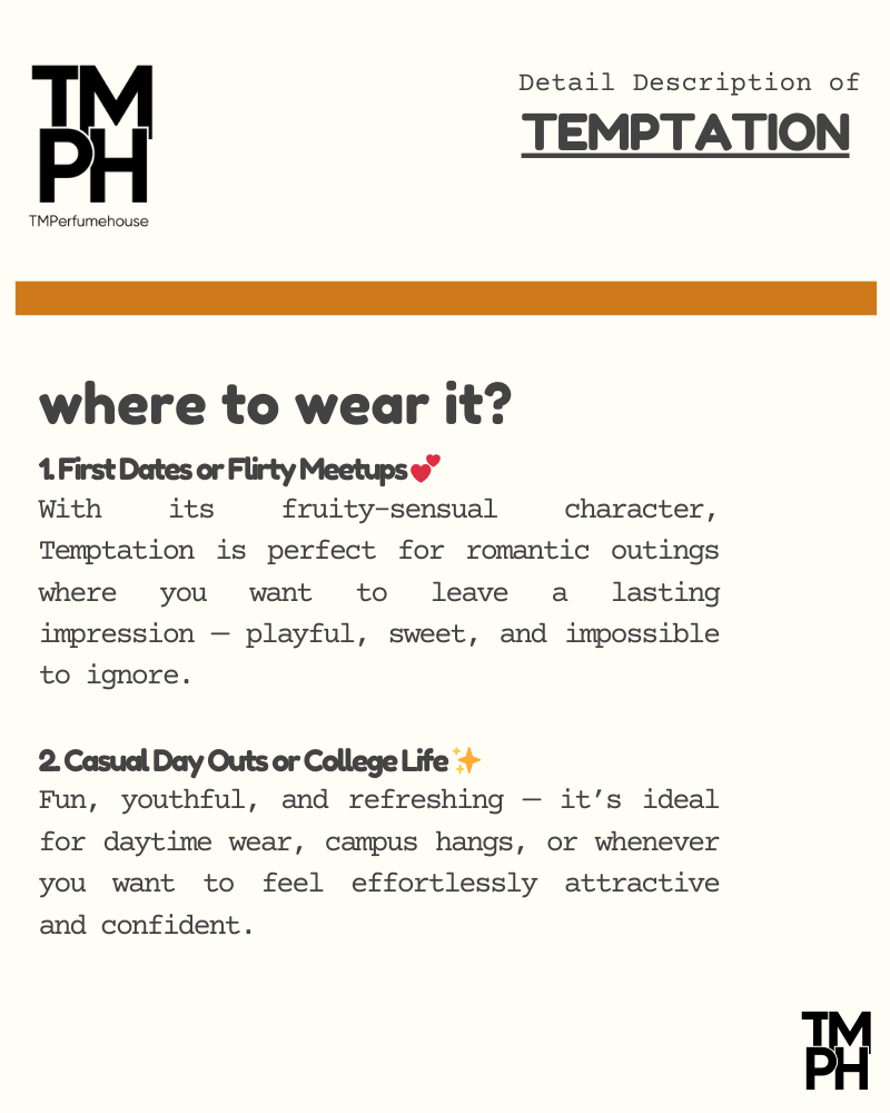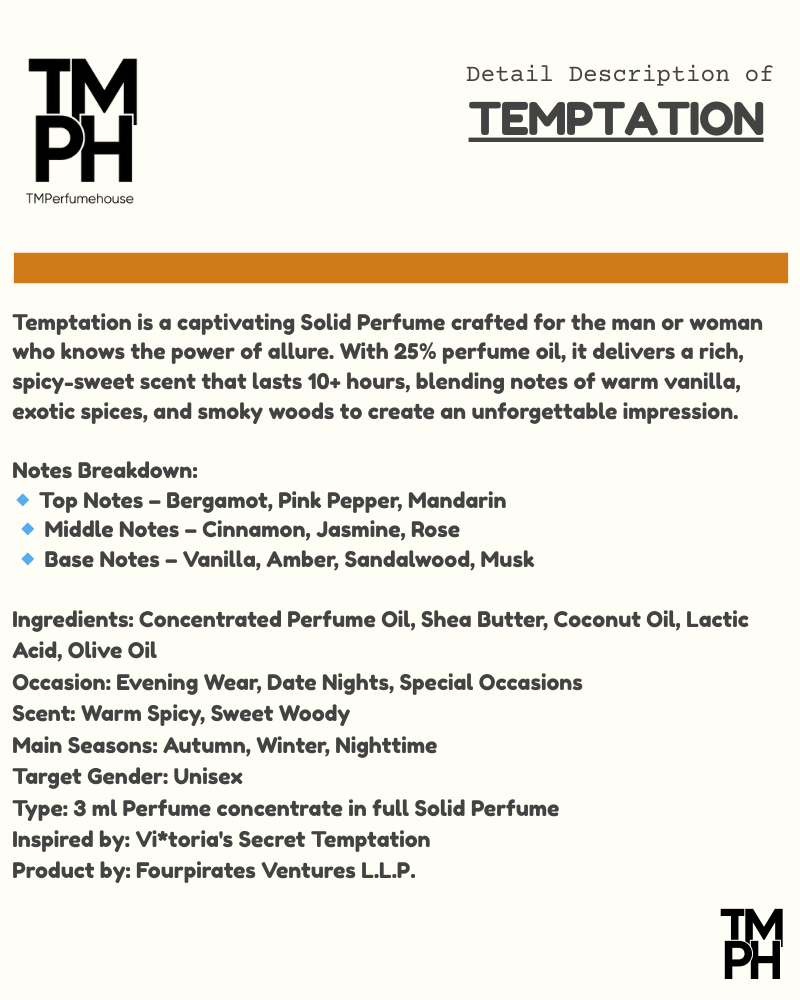 Temptationis a captivating Solid Perfume crafted for the manor woman who knows the power of allure. With 25% perfume oil,it delivers arich, spicy-sweet scent that lasts 10+ hours, blending notesof warm vanilla, exotic spices, and smoky woods to create an unforgettable impression.