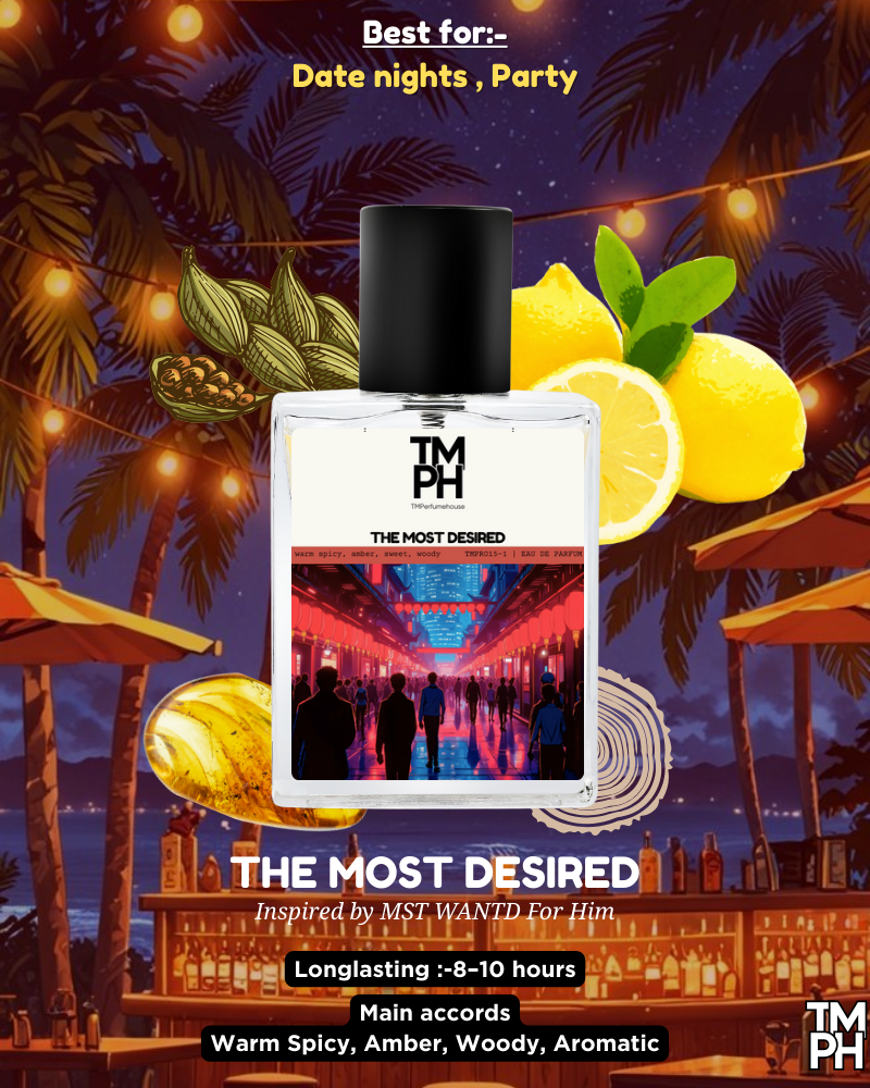 The most desired is a long lasting spicy woody inspired perfume for men with bold cardamom, sweet caramel, and deep woody notes. Designed for those who want a luxury fragrance experience at an affordable price.