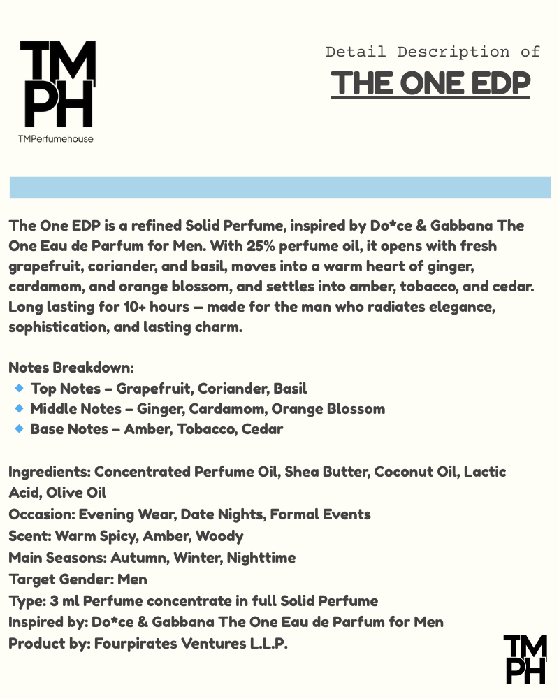The One EDPis a refined Solid Perfume, inspired by Do*ce & Gabbana The One Eau de Parfum for Men. With 25% perfume oil, it opens with fresh grapefruit, coriander, and basil, moves into a warm heart of ginger, cardamom, and orange blossom,and settles into amber, tobacco, and cedar. Long lasting for 10+ hours — made for the man whoradiates elegance, sophistication, and lasting charm.