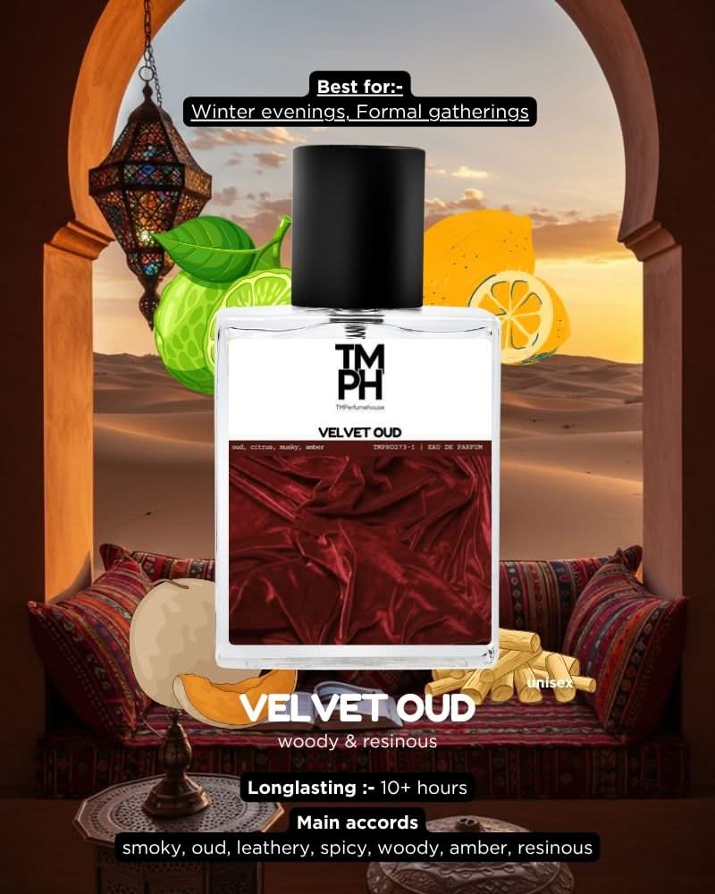 "Velvet Oud" is a deep, smoky, resinous oud fragrance wrapped in warm spices and dark woods. It opens bold and mysterious, slowly settling into a rich, ambery base that feels luxurious, powerful and Middle-Eastern inspired. Perfect for evening wear, special occasions and anyone who wants a strong, confident scent presence.