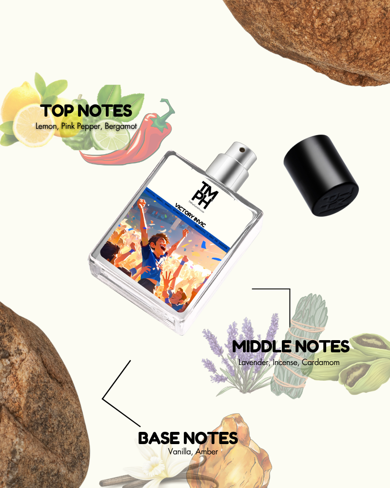 invic victory is a dynamic scent that captures strength and determination. It opens with bright lemon and sharp pink pepper, unfolding into a heart of lavender and frankincense for aromatic depth. The base of tonka bean, amber, and vanilla adds warmth and sweetness, creating a fragrance that is intense, modern, and irresistibly