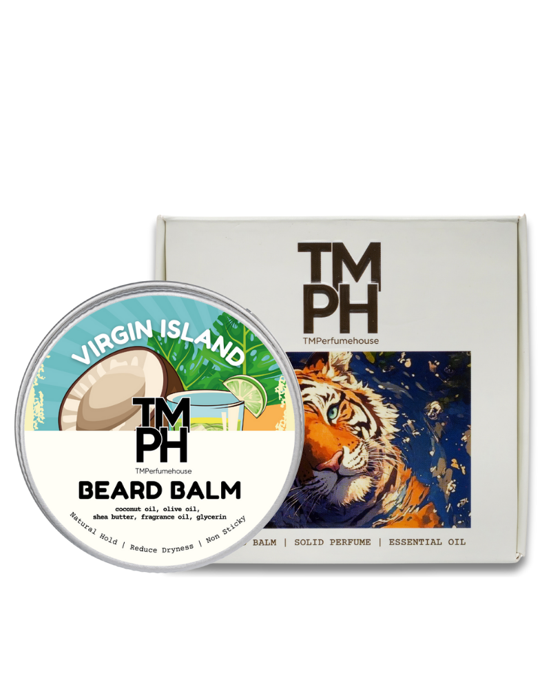 TM PH Beard Balm container with Virgin Island flavor label and packaging box featuring a tiger illustration.