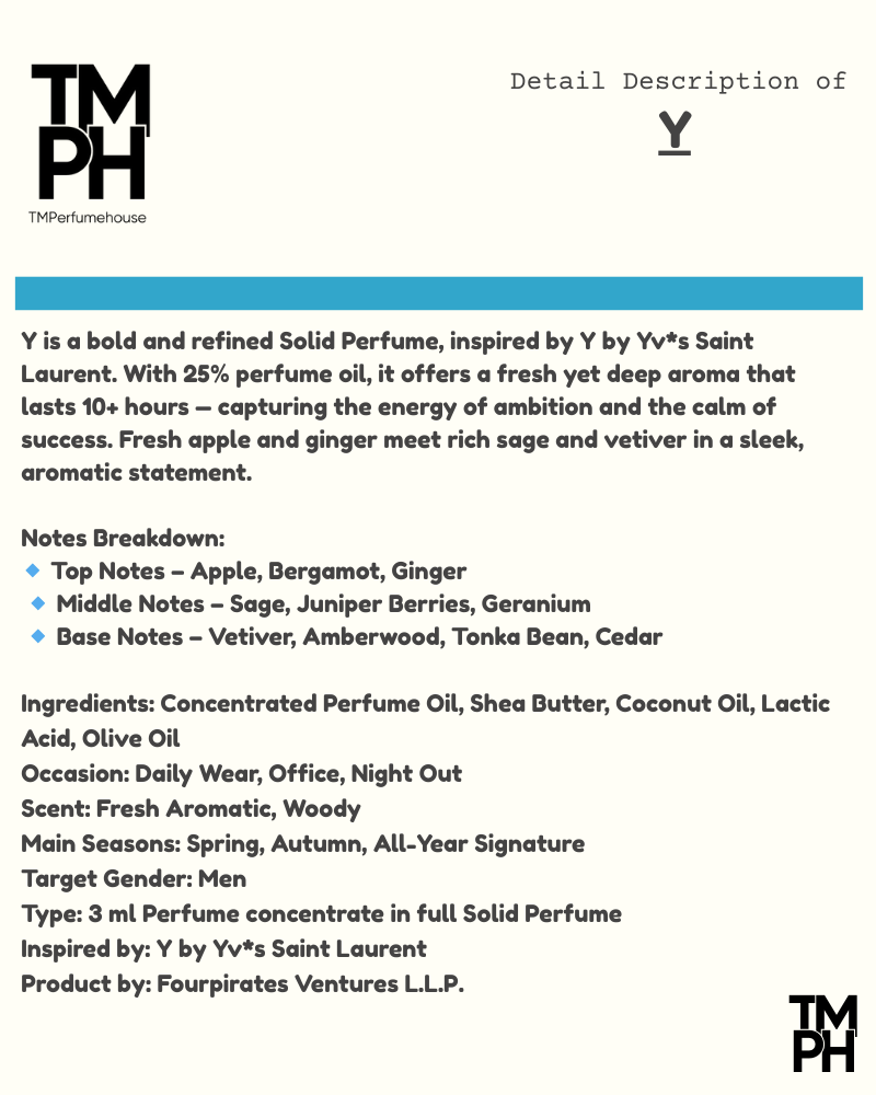 Y is a bold and refined Solid Perfume, inspired by Y by Yv*s Saint Laurent. With 25% perfume oil, it offers a fresh yet deep aroma that lasts10+ hours — capturing the energy of ambition and the calm of success. Fresh apple and ginger meet rich sage and vetiver in a sleek, aromatic statement.