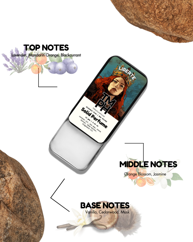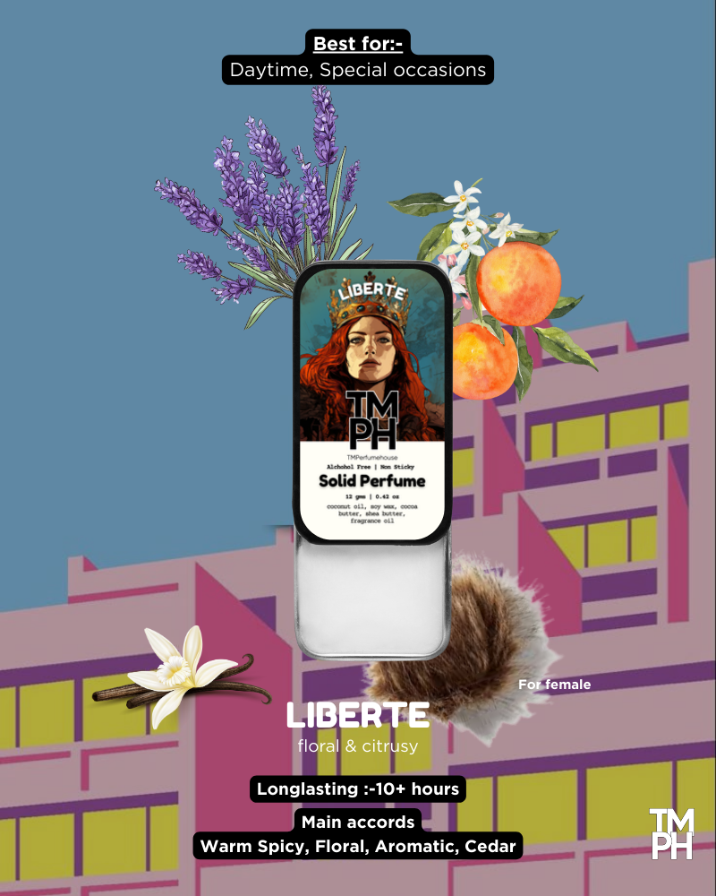LIBERTE Solid Perfume delivers a bold, modern, and empowering fragrance for confident, free-spirited individuals. It opens with bright lavender and sparkling citrus, then moves into a creamy floral heart of jasmine. Finally, it settles into a warm vanilla–musk base that feels powerful, sensual, and elegant. Perfect for daily wear, evenings out, and moments when you want to stand out effortlessly.